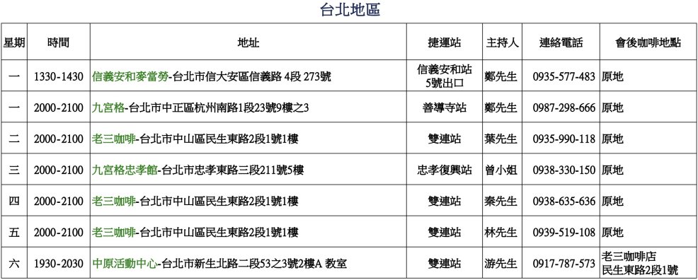 | 聚會時間: 請跟曾小姐 (0985-217-744) 或盧小姐 (0905-577-153) 洽詢 |